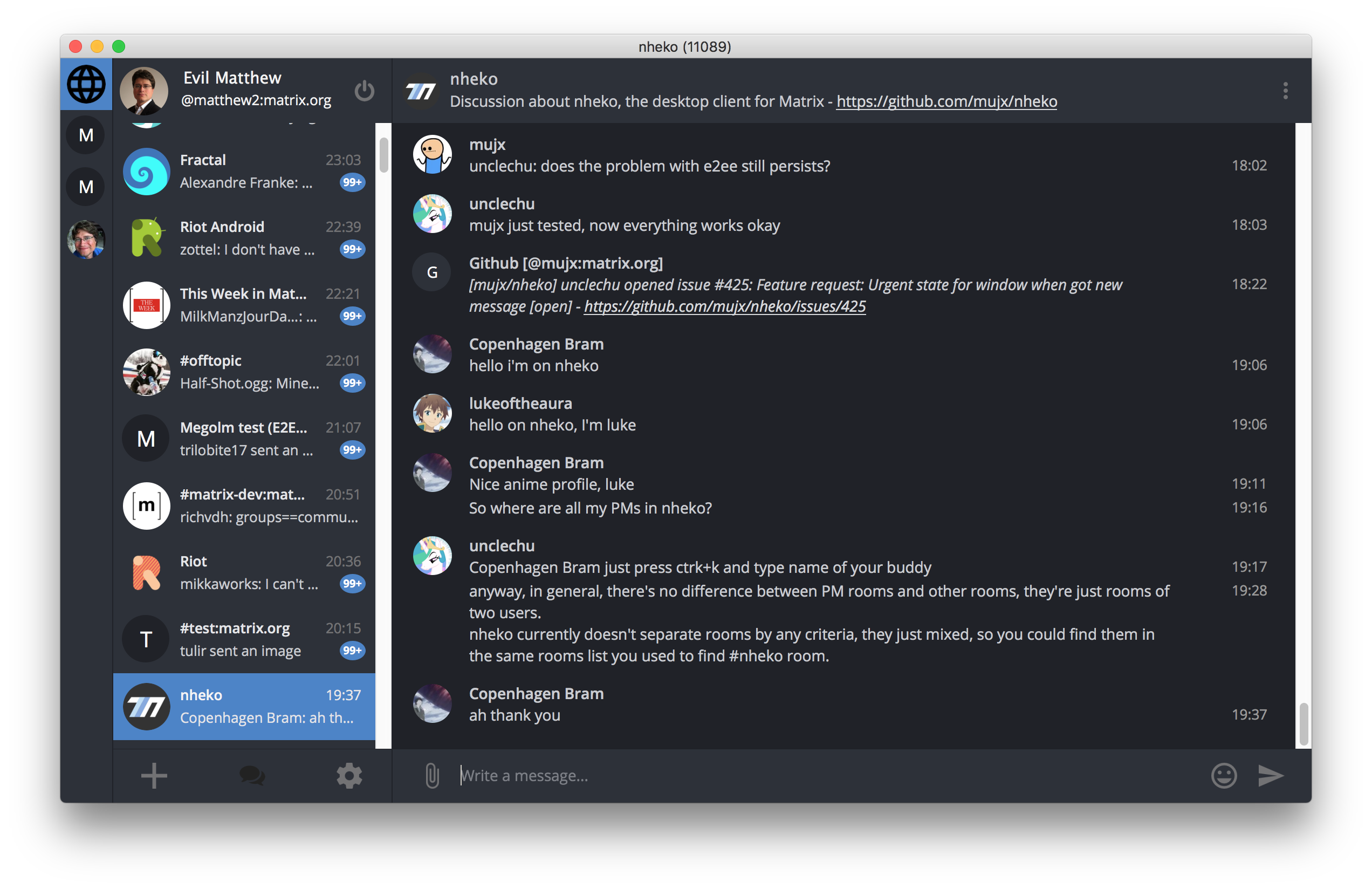 now bridges a lot more stuff, such as formatting, media and replies. I'm also almost done with desegregating users so that Matrix users join the same group chat portals rather than everyone having their own portal to the same chat
