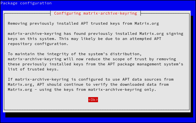 • A post-install script to remove any previously added Matrix.org package signing keys from /etc/apt/trusted.gpg. (This is the file apt-key add most commonly uses, and the most commonly found bad advice on the Internet.)
