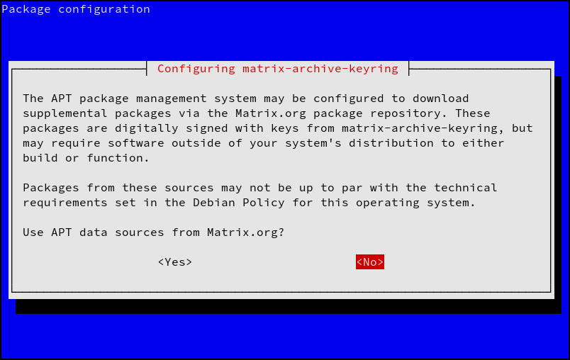 If you are a Debian or Ubuntu user and Synapse homeserver operator using Matrix.org repositories, I'll be towncrying when this package becomes available as much as I can. All you should need to do then is apt install matrix-archive-keyring and it should patch the security holes in your operating system if you've formerly installed packages from Matrix.org or Riot.im! (The command may change a bit, because next Debian operating system release "Buster" has entered soft-freeze just today (2019-02-12) and not accepting new packages into that release.)