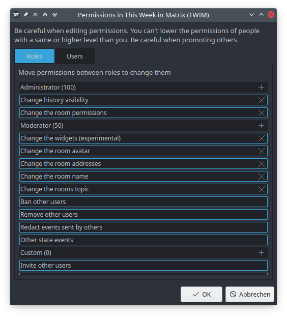 We added a way to edit permissions in Nheko now. It is an unconventional drag and drop dialog, where you drag users and permissions between different roles. We are hoping that this will make powerlevels easier to understand. Be careful when trying it, the wrong powerlevels might make your room unusable. Now... the bad part about that is, that powerlevels add around 50-100 new strings to translate... Help is appreciated! <3