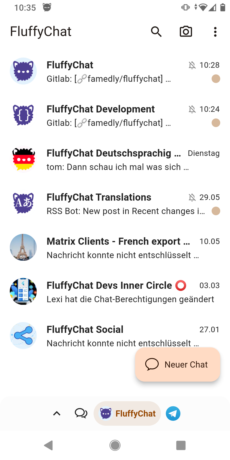 FluffyChat 1.5.0 has been released and will soon be in all stores. This release comes with a bunch of bugfixes and introduces the first iteration of a Material You based design. We also try to support Android 12 accent colors (while this does not seem to work yet). On other platforms, our own purple shape will stay the default.
