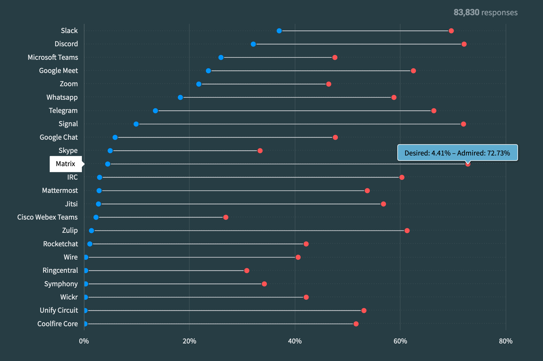 Of the 83,830 folks surveyed, Matrix was the #1 chat tool in terms of current users' satisfaction. It was also rated as the most desirable among the open source tools with open governance, but there is a lot of room for improvement in awareness. Weβre excited to build on this 2024! π