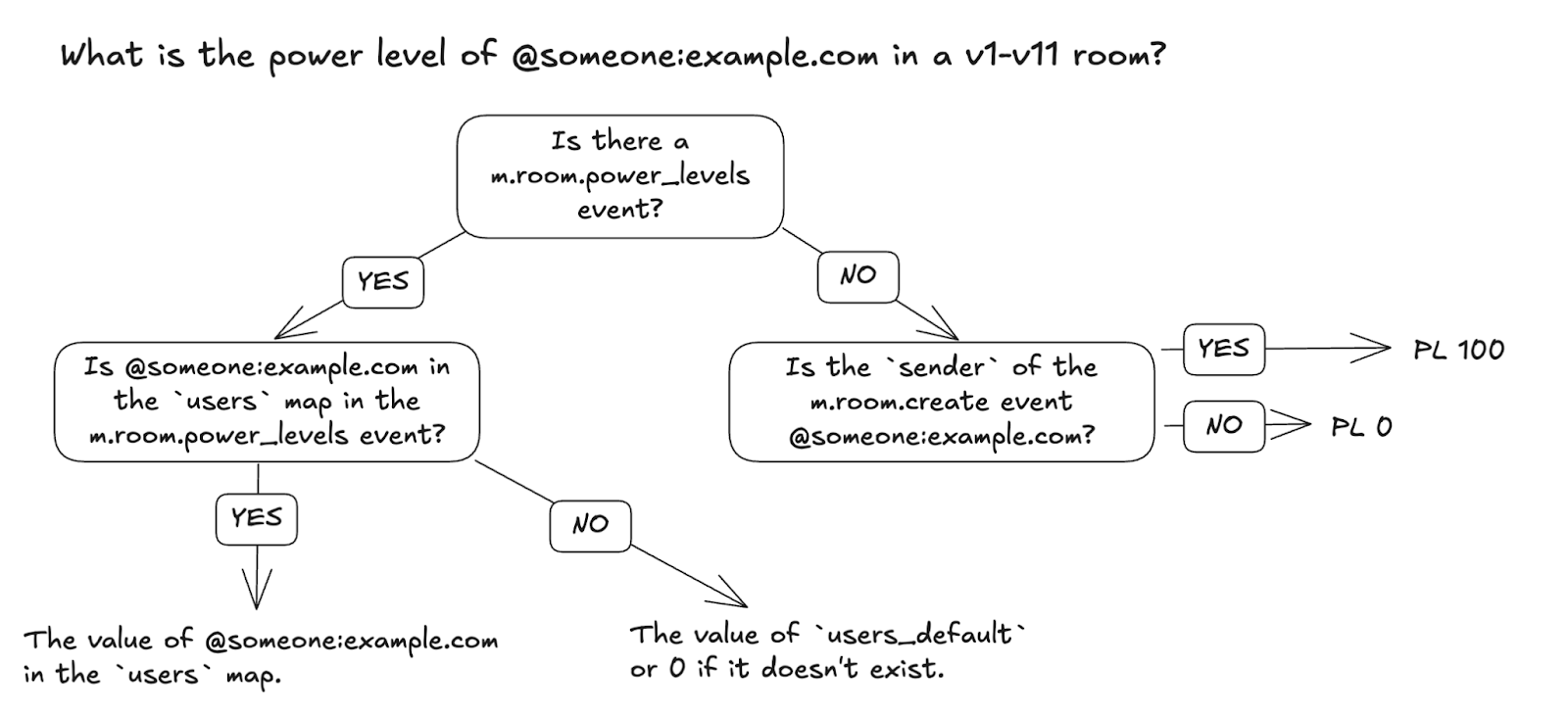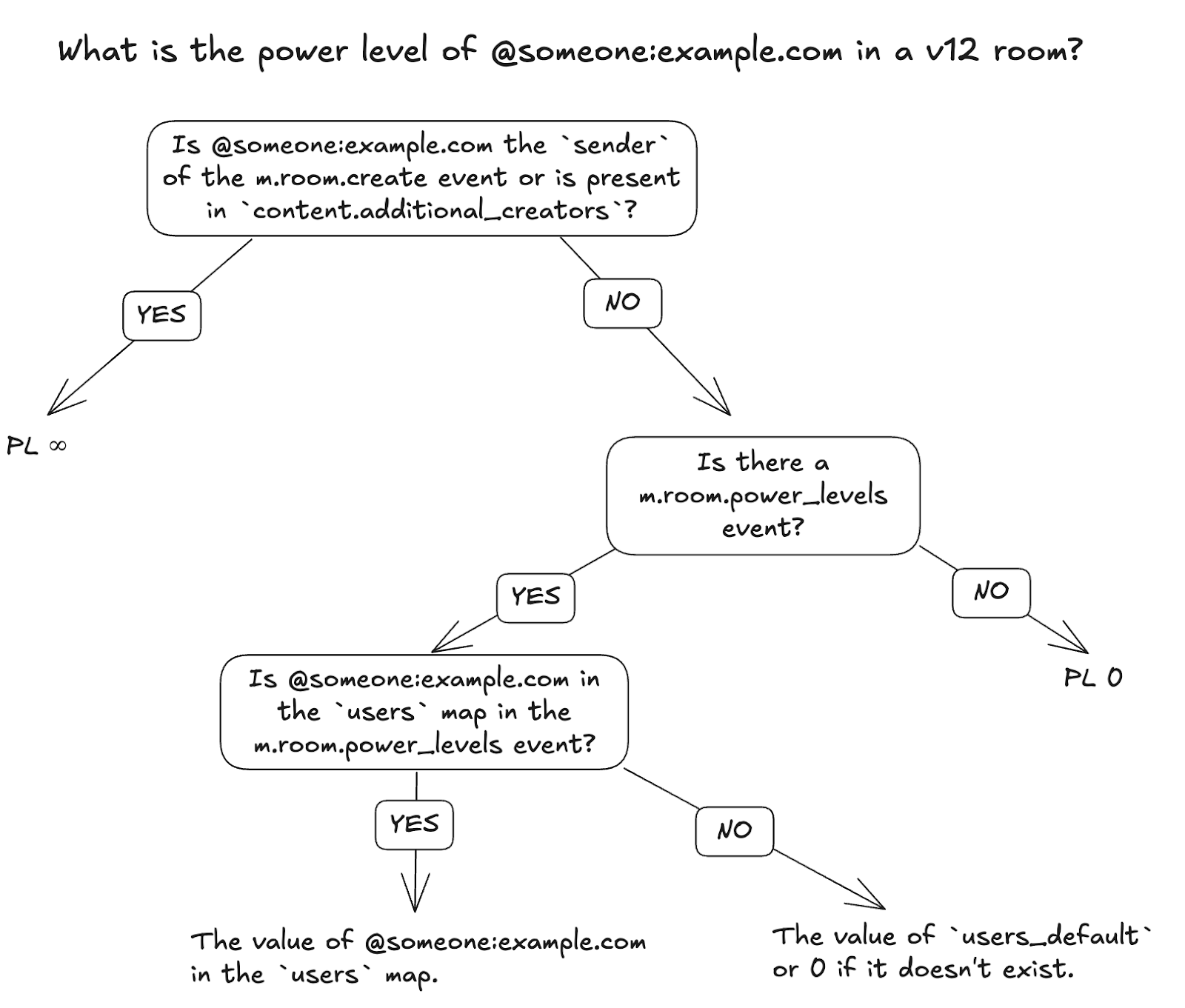 Note in both cases clients need the m.room.create event and m.room.power_levels event to accurately determine the power level of users. Since most rooms have a m.room.power_levels event, many clients failed to implement first branching “no” in v1-v11 rooms. The new rules take into account the privileged position of room creators whilst also ensuring that clients implement the full decision flow chart.
